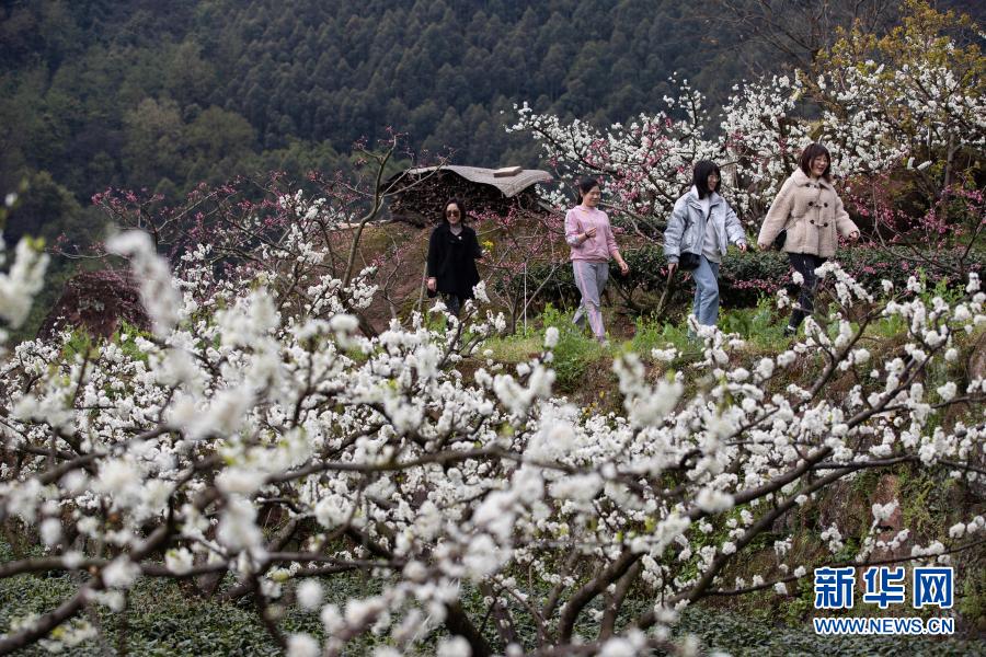 3月1日,游客徜徉在幸福古村的花叢中。新華社記者 江宏景 攝