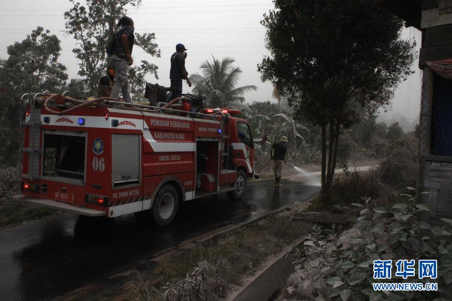 3月2日,印度尼西亞北蘇門(mén)答臘省卡羅的消防員清洗被火山灰覆蓋的道路。