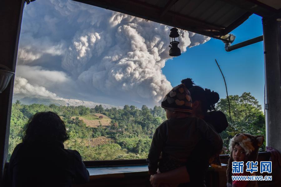 3月2日,人們在印度尼西亞北蘇門答臘省卡羅觀看噴發(fā)的錫納朋火山。新華社發(fā)(森比林?jǐn)z)