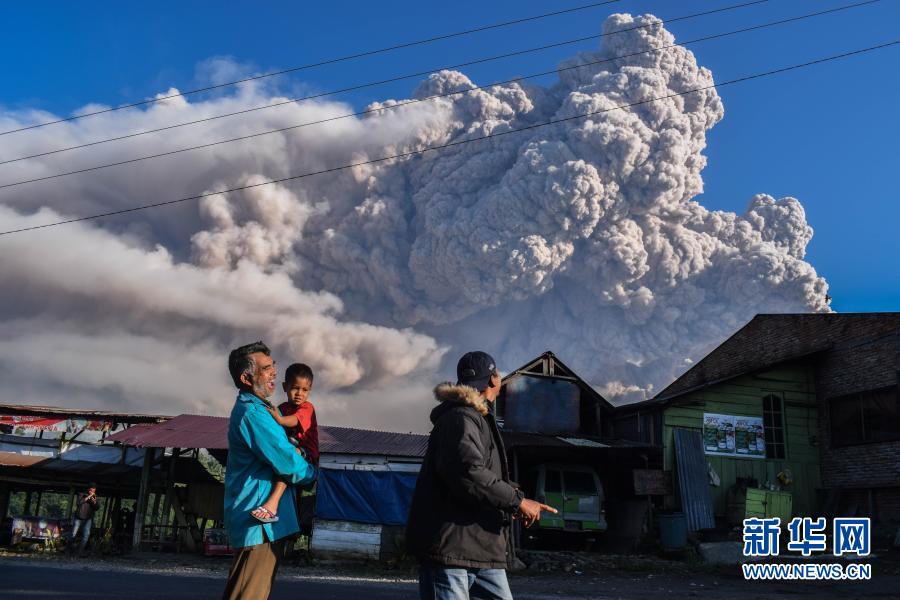 3月2日,人們?cè)谟《饶嵛鱽啽碧K門答臘省卡羅觀看噴發(fā)的錫納朋火山。新華社發(fā)(森比林?jǐn)z)
