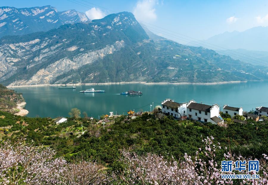 春到三峽,桃花盛開,江水碧綠,船舶往來如梭,構成一幅幅美麗的圖畫。