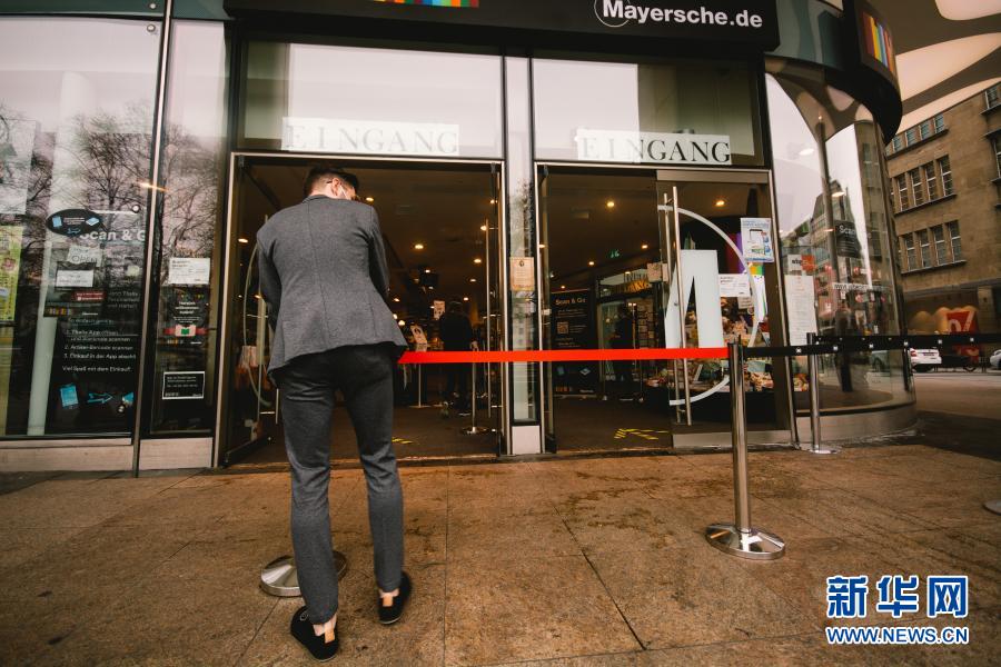 3月8日,德國(guó)科隆一家書店的工作人員在入口處拉起護(hù)欄,限制客流。