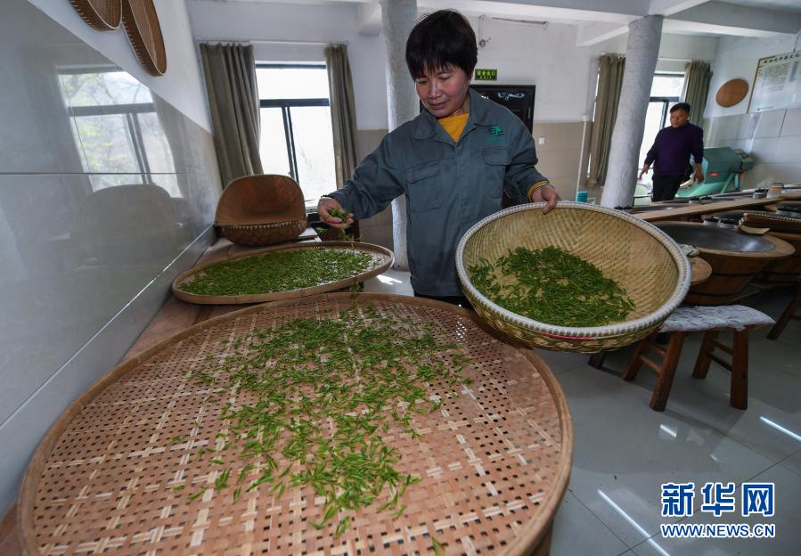 3月12日,在杭州市西湖風景名勝區(qū)滿覺隴村的中國茶葉博物館滿覺隴炒茶中心內(nèi),茶農(nóng)把西湖龍井茶鮮葉進行攤青。