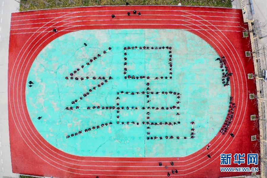 騎路小學(xué)的學(xué)生們?cè)诓賵?chǎng)上排列站隊(duì)成“繩”字造型(3月9日攝,無(wú)人機(jī)照片)。新華社記者 李博 攝