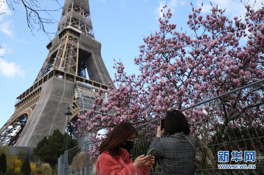3月19日,在法國(guó)巴黎埃菲爾鐵塔腳下的戰(zhàn)神廣場(chǎng),人們駐足欣賞玉蘭花。新華社記者高靜攝