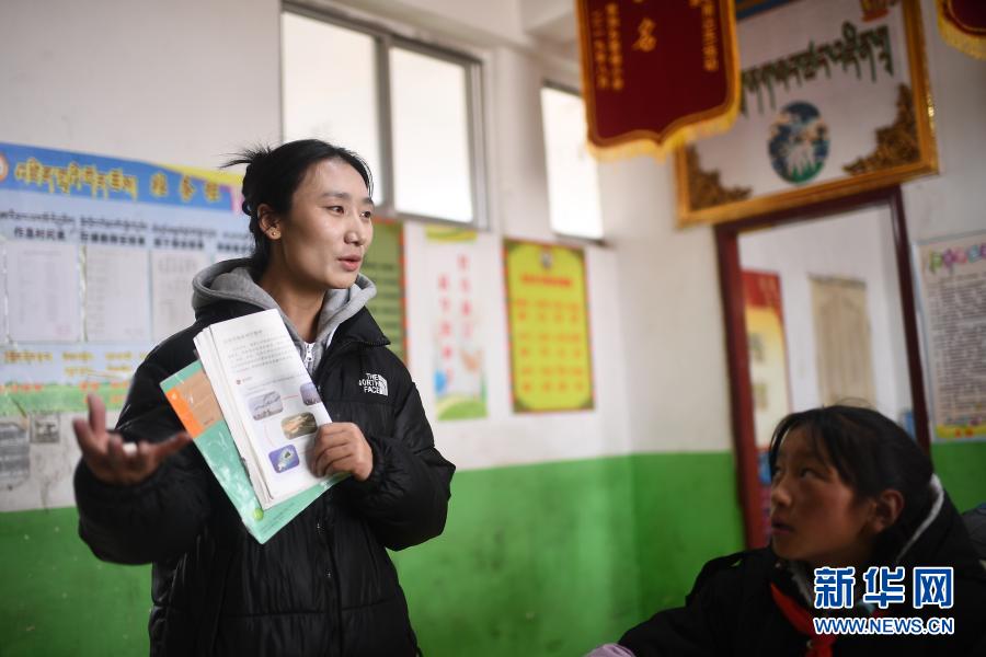 3月16日,索加鄉(xiāng)寄宿小學(xué)語文老師查日在為學(xué)生上課。新華社記者 張宏祥 攝