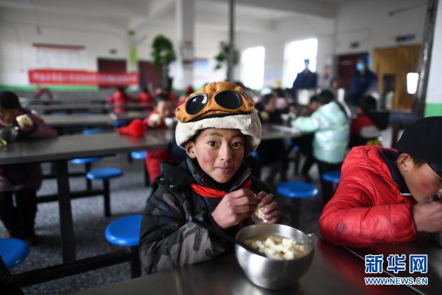 3月16日,在索加鄉(xiāng)寄宿小學(xué)食堂,格來(lái)達(dá)杰(前)在吃晚餐。新華社記者 韓方方 攝