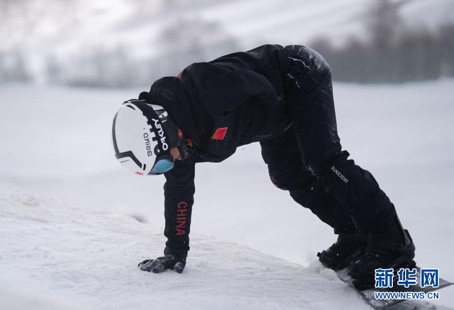 3月20日,冬殘奧會國家集訓(xùn)隊單板滑雪運動員汪志鵬在冬殘奧會訓(xùn)練基地訓(xùn)練時摔倒后起身。新華社記者 才揚(yáng) 攝