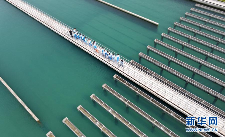 3月21日,水廠工作人員向?qū)W生介紹自來(lái)水生產(chǎn)流程(無(wú)人機(jī)照片)。