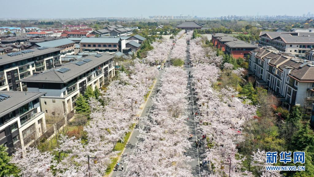 3月26日拍攝的江蘇省揚(yáng)州市鑒真路“櫻花大道”(無人機(jī)照片)。