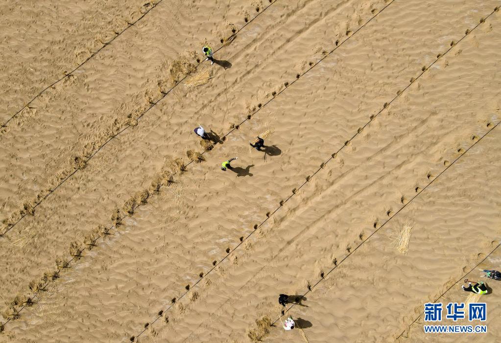3月28日,人們在且末縣城不遠(yuǎn)處的塔克拉瑪干沙漠內(nèi)植樹(無人機照片)。