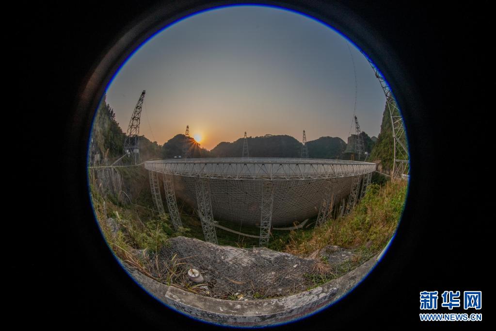 3月29日拍攝的晚霞中的“中國(guó)天眼”全景(維護(hù)保養(yǎng)期間魚(yú)眼鏡頭拍攝)。