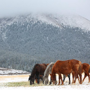當(dāng)日,受冷空氣影響,位于甘肅省河西走廊中部、祁連山北麓的山丹馬場降雪,馬群在雪原上奔跑覓食,構(gòu)成了一幅壯美高原雪景 。