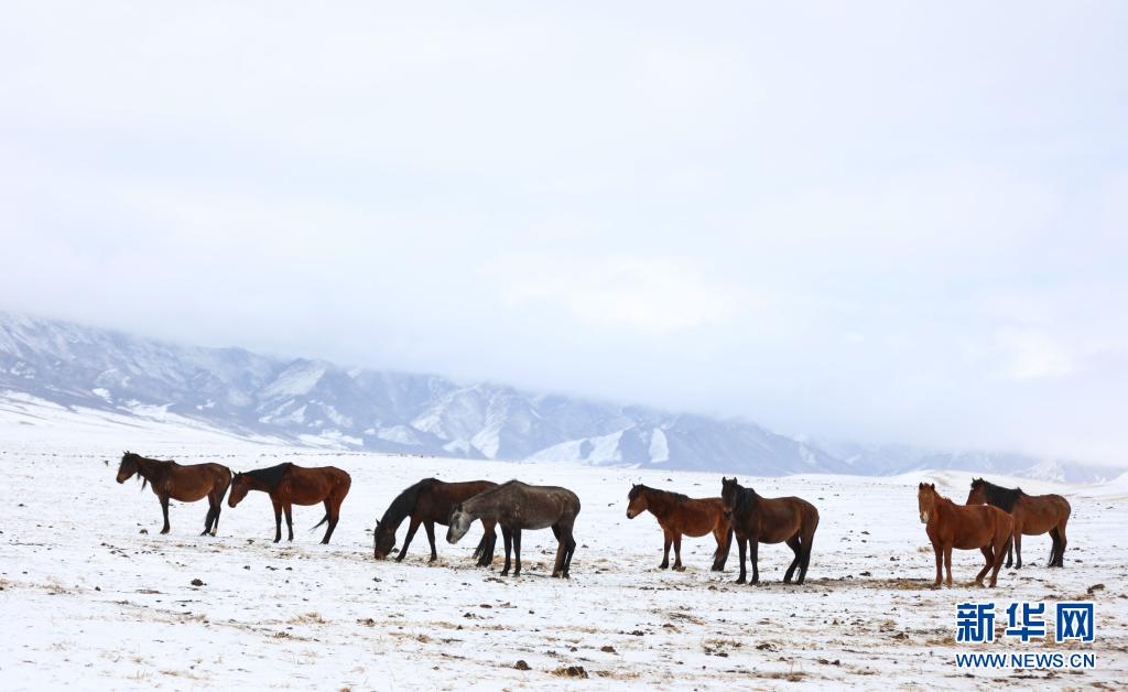 當(dāng)日,受冷空氣影響,位于甘肅省河西走廊中部、祁連山北麓的山丹馬場降雪,馬群在雪原上奔跑覓食,構(gòu)成了一幅壯美高原雪景 。