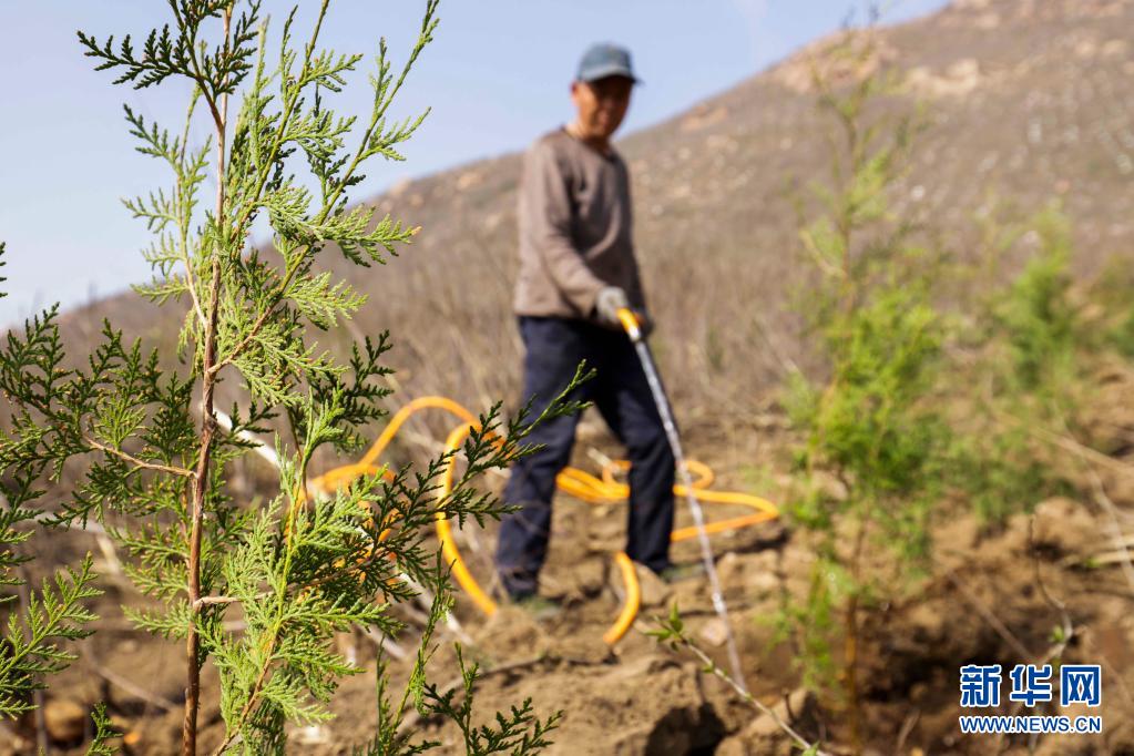 3月31日,造林隊員在河北省遵化市石門鎮(zhèn)金星山給新栽的樹苗澆水。