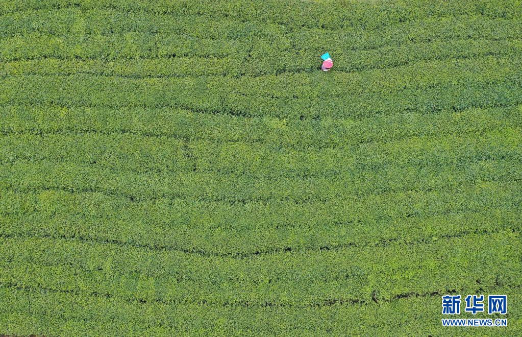4月2日,茶農(nóng)在福鼎市佳陽畬族鄉(xiāng)的一處茶山采茶(無人機照片)。新華社記者 林善傳 攝