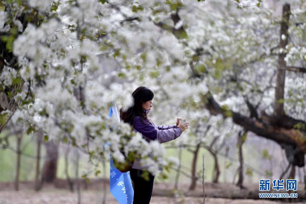 4月3日,游客在中衛(wèi)市南長(zhǎng)灘村拍攝盛開(kāi)的梨花。