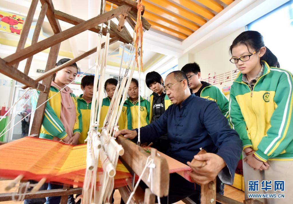 4月7日,威縣土布紡織技藝傳承人高慶海在威縣第四小學向?qū)W生演示老粗布紡織技藝。近年來,河北省邢臺市威縣積極開展“非遺傳承進校園”活動,將當?shù)靥厣沁z項目引入學校課堂,讓學生近距離感受民間傳統(tǒng)技藝的魅力,促進非遺文化的保護和傳承。新華社記者 朱旭東 攝