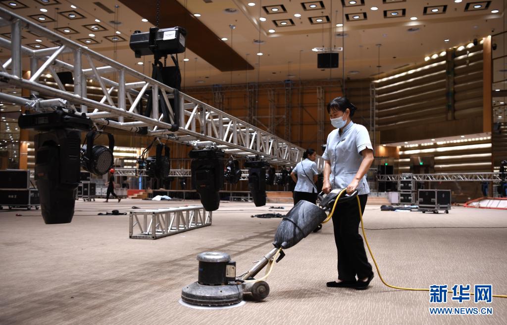 4月10日,工作人員在對主會場進(jìn)行清潔作業(yè)。