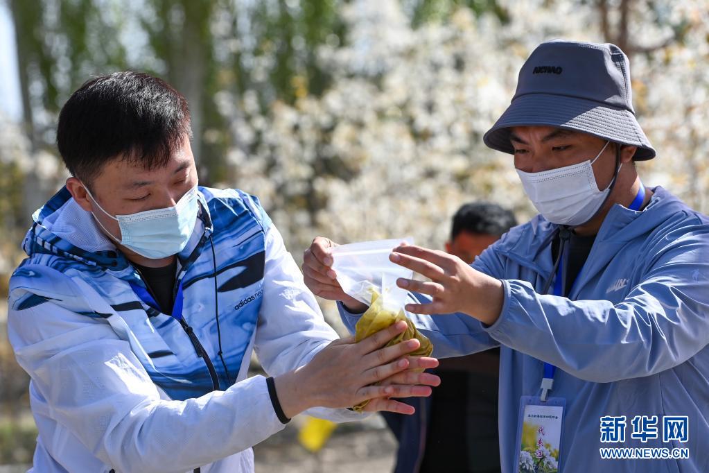 4月11日,在鐵門關(guān)市一處香梨示范園,技術(shù)人員將花粉溶解。