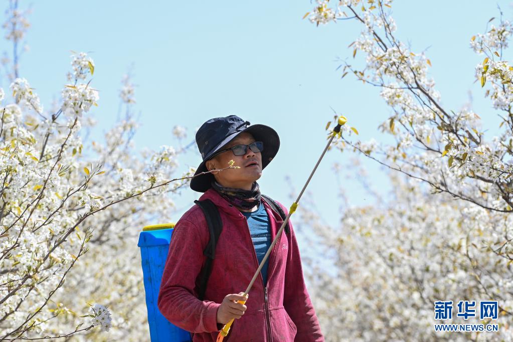 4月11日,在鐵門關市一處梨園,梨農(nóng)為梨花授粉。新華社記者 丁磊 攝