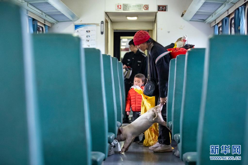 在5633次列車上,彝族乘客帶著的小豬從袋子里爬了出來(4月11日攝)。新華社記者 沈伯韓 攝