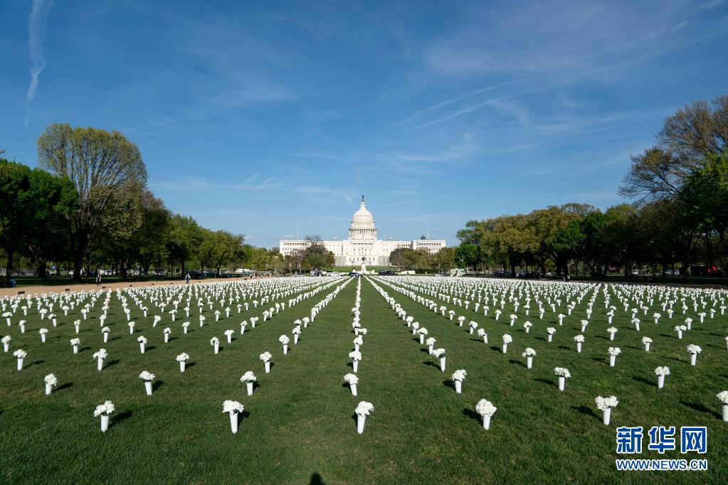 這是4月13日拍攝的美國華盛頓國家廣場草坪上擺放的白色絹花。