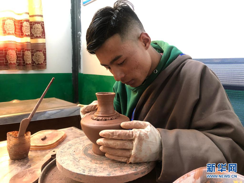 青海省玉樹藏族自治州囊謙縣吉曲鄉(xiāng)山榮村村民在扶貧產(chǎn)業(yè)園內(nèi)制作黑陶(2020年7月4日攝)。