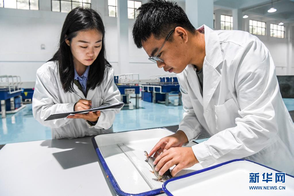 4月20日,大藤峽魚類增殖放流站的袁婷博士(左)與同事一起收集野生魚的生物數據。