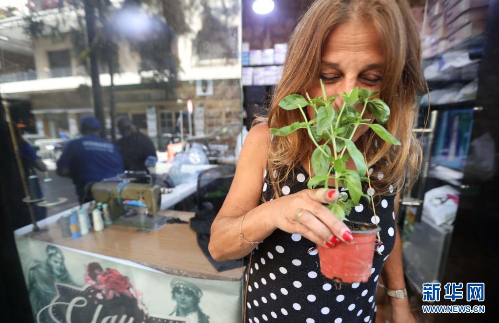 4月22日,一名女子在黎巴嫩首都貝魯特嗅聞獲贈的秧苗。