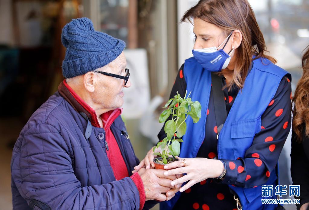 4月22日,“世界地球日”活動參與者在黎巴嫩首都貝魯特向一名男子派發(fā)秧苗。