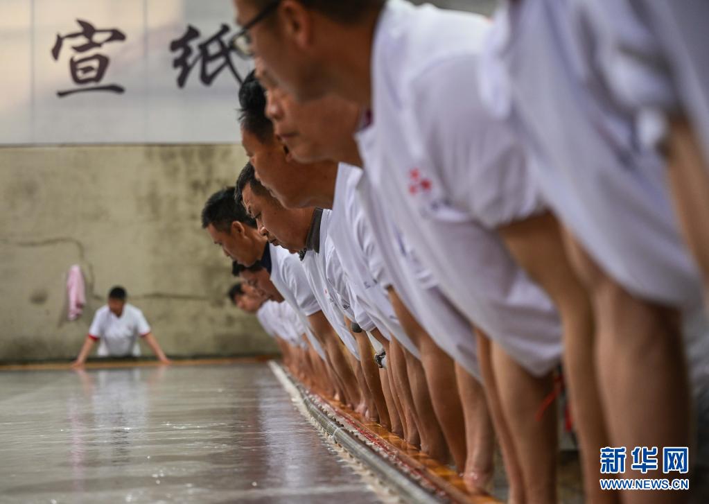 近日,在宣紙產(chǎn)地安徽省宣城市涇縣,“四丈宣紙”的抄制在一家紙業(yè)有限公司啟動。50余名撈紙師傅操作巨型紙簾,齊心協(xié)力,在紙槽旁進行撈紙作業(yè)。來回起落兩次,動作整齊劃一。隨后工人們將紙簾吊起放至一邊揭下,一張巨大的宣紙便撈制成功。經(jīng)過曬、剪等工序后, 制成長13.2米、寬3.6米的巨型宣紙就是“四丈宣紙”。