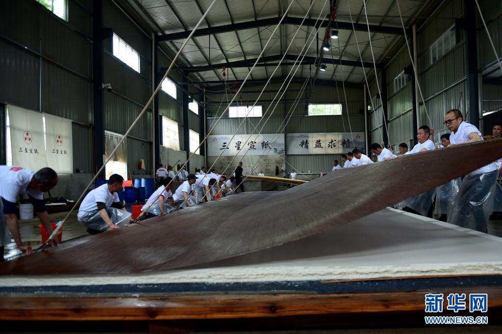近日,在宣紙產(chǎn)地安徽省宣城市涇縣,“四丈宣紙”的抄制在一家紙業(yè)有限公司啟動。50余名撈紙師傅操作巨型紙簾,齊心協(xié)力,在紙槽旁進行撈紙作業(yè)。來回起落兩次,動作整齊劃一。隨后工人們將紙簾吊起放至一邊揭下,一張巨大的宣紙便撈制成功。經(jīng)過曬、剪等工序后, 制成長13.2米、寬3.6米的巨型宣紙就是“四丈宣紙”。