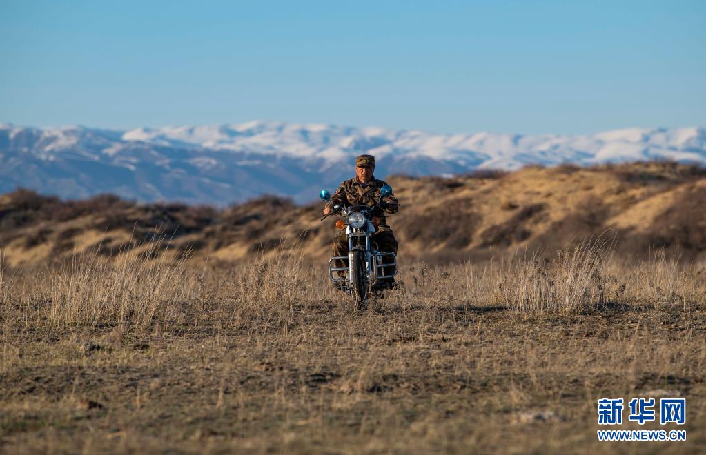 新疆生產建設兵團第10師185團職工馬軍武騎摩托行駛在管護轄區(qū)內(4月9日攝)。