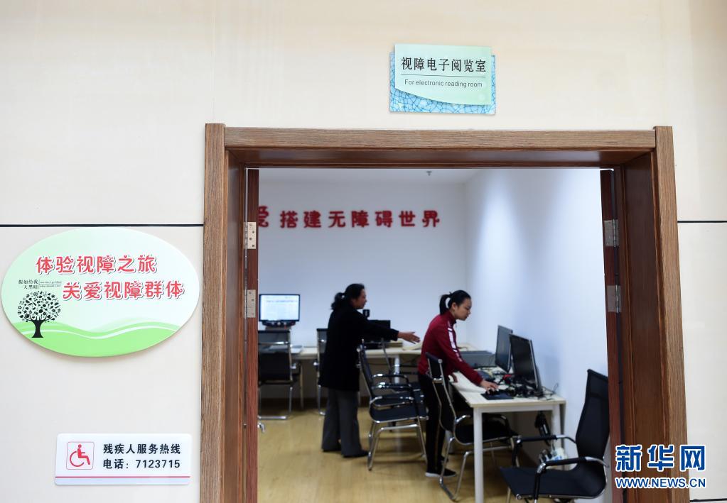 4月28日,葉景芬(右)在媽媽林鳳玉陪伴下,在龍泉市圖書館視障電子閱覽室查閱盲文資料。新華社記者 韓傳號(hào) 攝