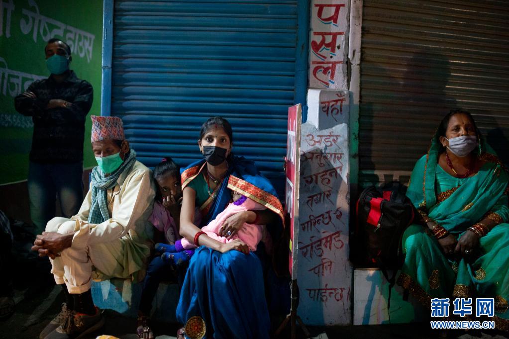 4月28日晚,人們在尼泊爾首都加德滿都的路邊等車,準備在封禁措施實施前離開加德滿都返回家鄉(xiāng)。