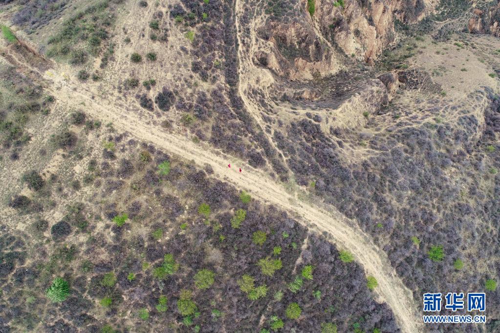 4月27日,延長(zhǎng)氣田采氣二廠巡線隊(duì)員在巡線途中(無(wú)人機(jī)照片)。