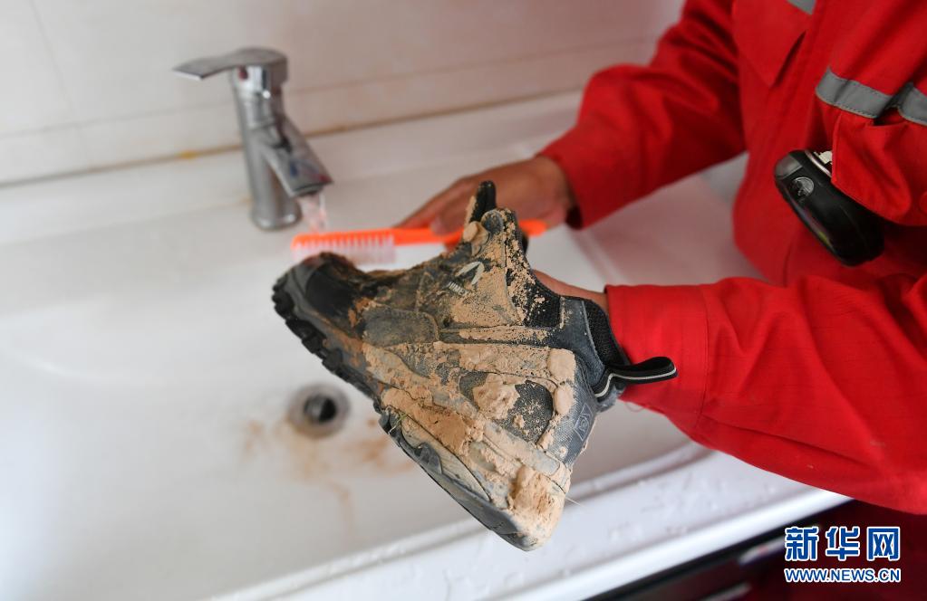 4月28日,巡線隊員侯勵峰結(jié)束巡線后清洗登山鞋。新華社記者 張博文 攝