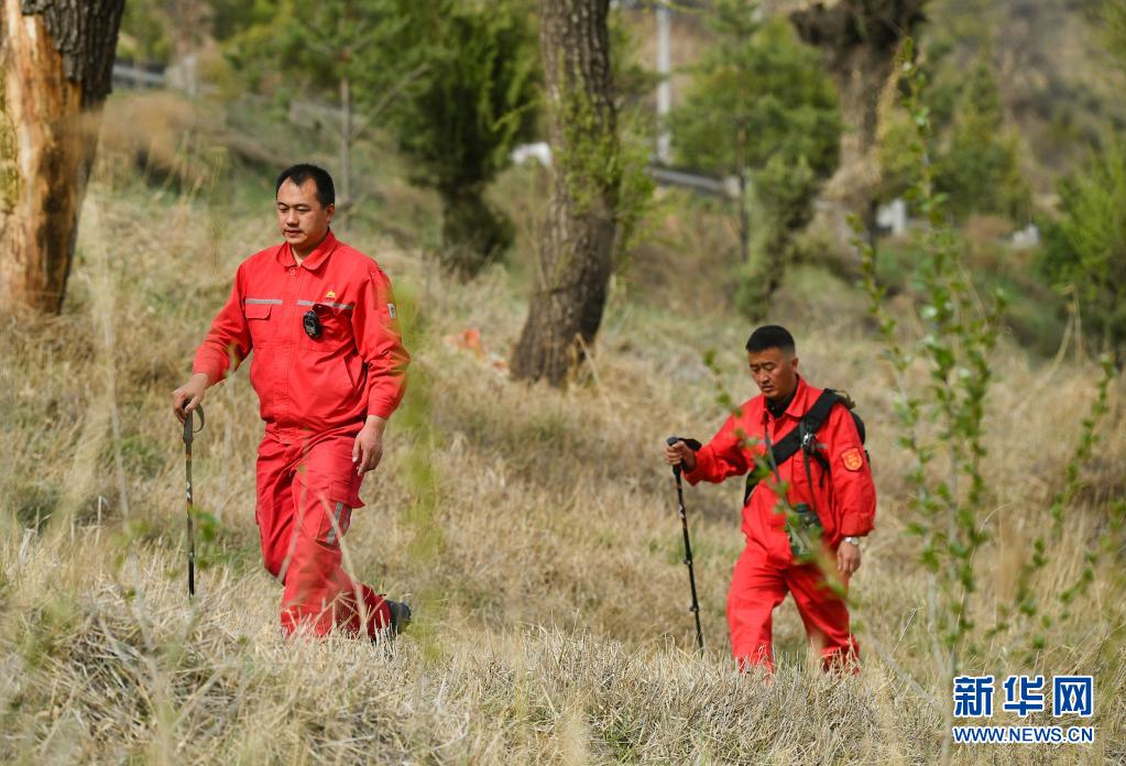 4月27日,巡線隊員張偉偉(左)、張浩軍在巡線途中。新華社記者 張博文 攝