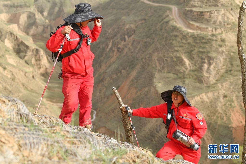 4月28日,巡線隊員侯勵峰(左)、曹碩在巡線途中休息。新華社記者 張博文 攝