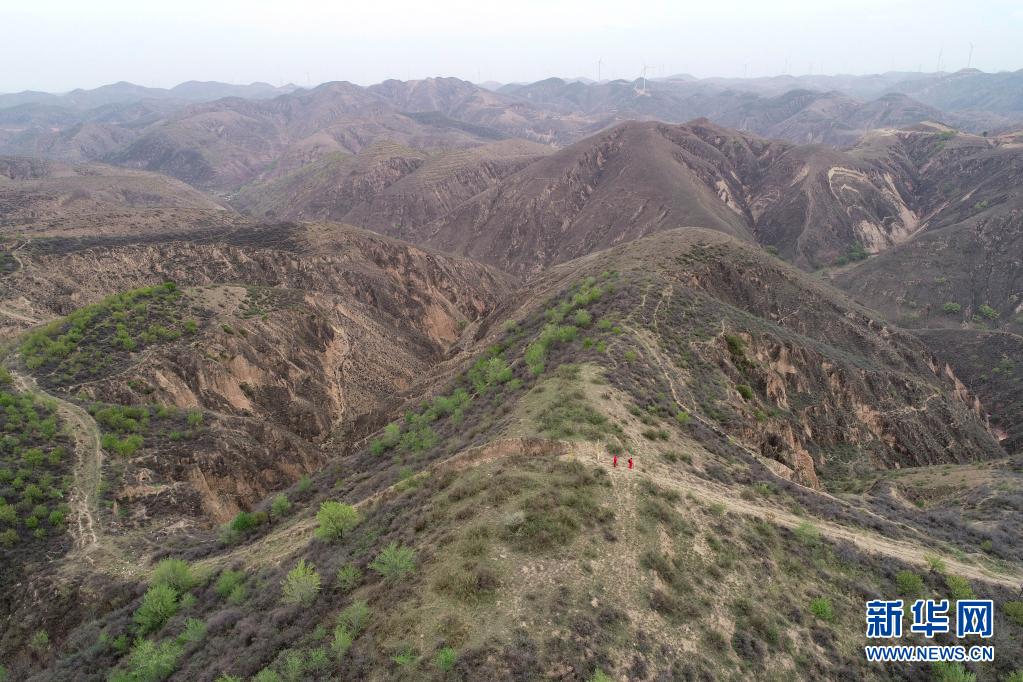 4月27日,延長氣田采氣二廠巡線隊(duì)員在巡線途中(無人機(jī)照片)。新華社記者 張博文 攝