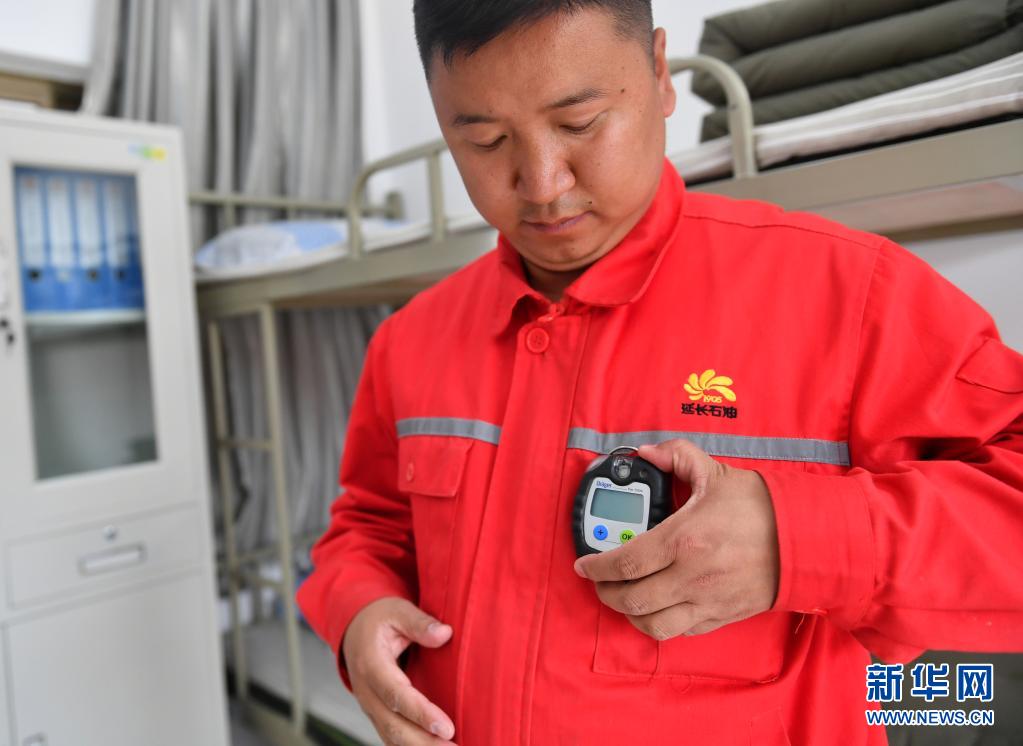 4月28日,巡線隊(duì)員侯勵(lì)峰出發(fā)前佩戴氣體檢測報(bào)警儀。新華社記者 張博文 攝