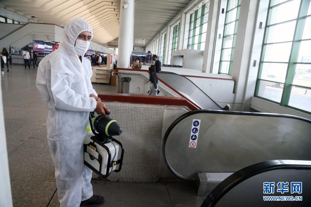 4月29日禁令實施前,一名身穿防護服的清潔工人在土耳其安卡拉的公共汽車站消毒。