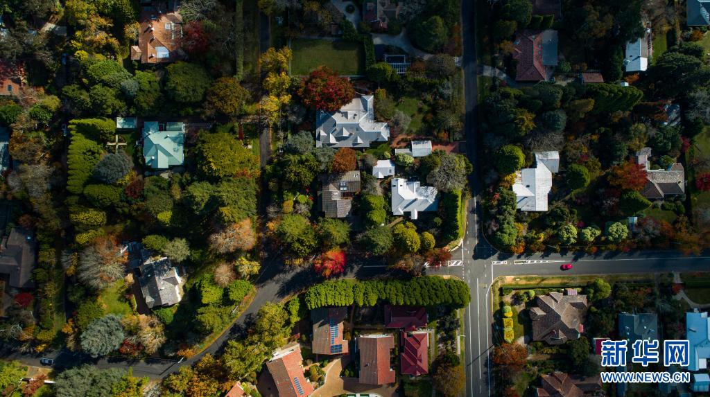 這是5月3日在澳大利亞悉尼西部藍(lán)山地區(qū)拍攝的多彩的街道(無(wú)人機(jī)拍攝)。