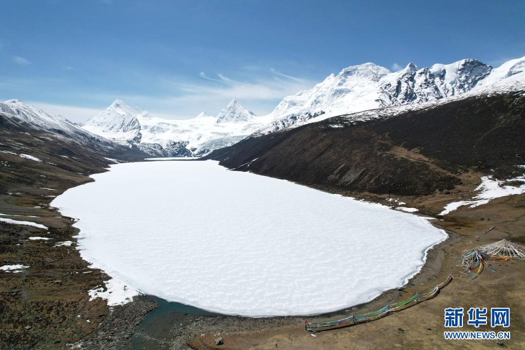這是5月4日拍攝的薩普雪山和雪山腳下的冰湖(無人機(jī)照片)。