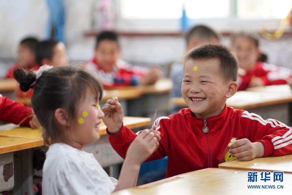 5月7日,河北省邢臺(tái)市內(nèi)丘縣南賽中心小學(xué)的學(xué)生在教室做貼笑臉游戲。世界精神衛(wèi)生組織將每年的5月8日定為“世界微笑日”,希望通過(guò)微笑促進(jìn)人類身心健康,增進(jìn)社會(huì)和諧。新華社發(fā)(劉繼東 攝)