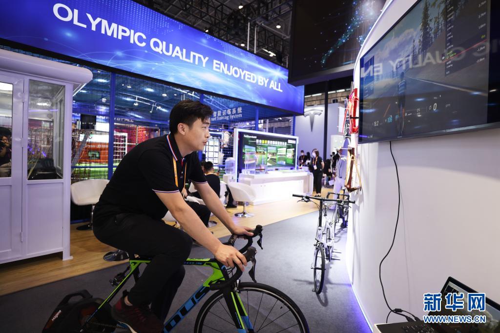5月7日,觀眾在消博會現(xiàn)場體驗自行車。