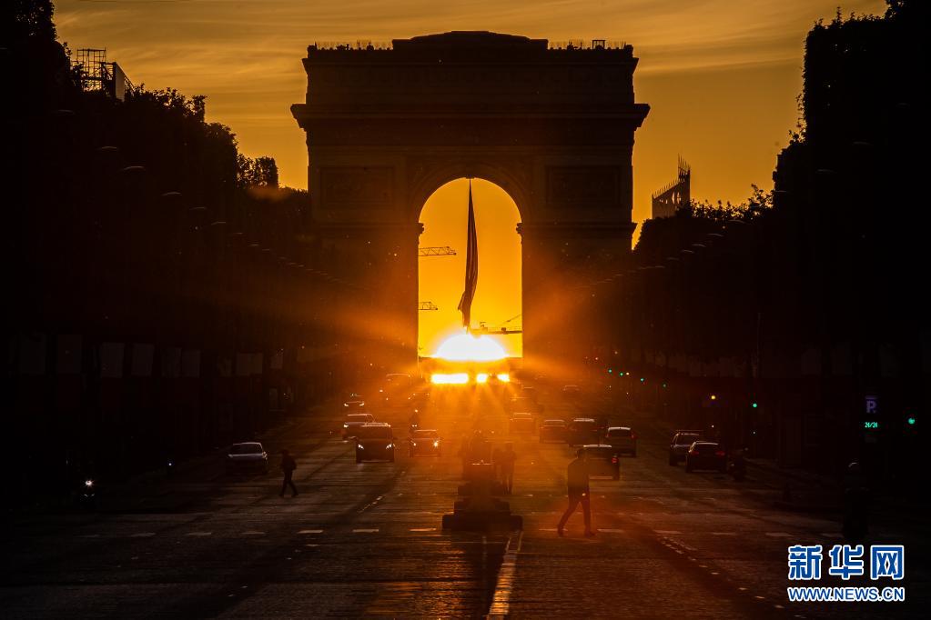 這是5月8日在法國(guó)巴黎香榭麗舍大街拍攝的凱旋門(mén)落日景象。