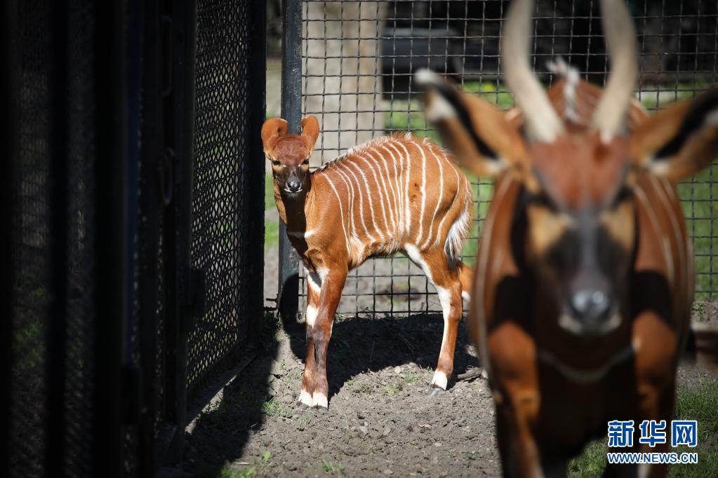 5月10日,兩周大的幼年山地紫羚與母親一起在波蘭首都華沙的華沙動物園的籠舍中散步。