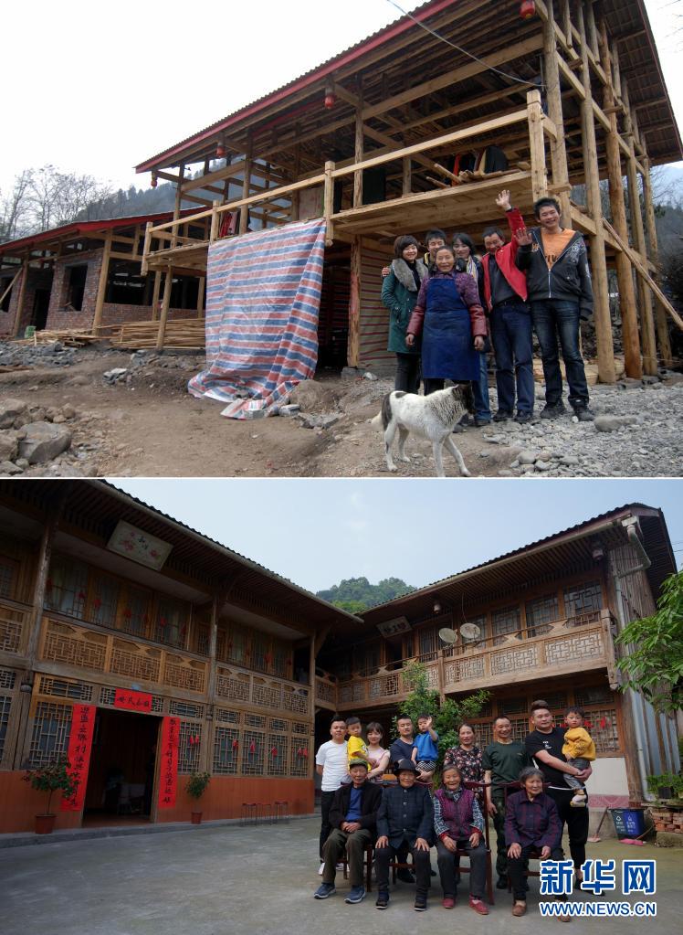 這是一張拼版照片,上圖為林興聰(右二)、李蕓香(右三)和家中的老人、孩子在重建中的住房前留影(2009年1月25日,新華社記者江毅攝);下圖為林興聰(后右三)、李蕓香(后右四)一大家13 口人在房前留影(2021年5月4日,新華社記者江宏景攝)。